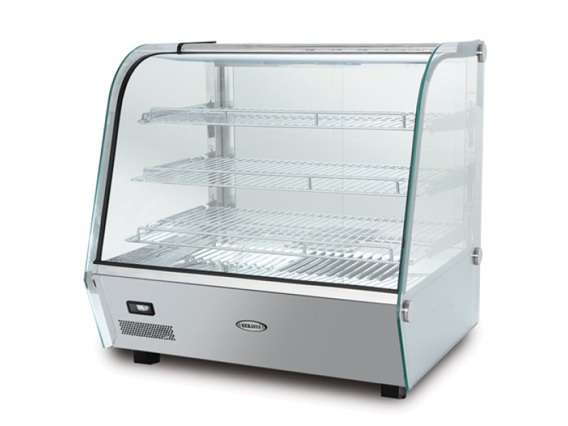 This Electric Food Warmer features a stainless steel body, tempered glass construction, and chrome plated wire shelves. It has four sides of clear glass and an internal light for convenience. The thermostat's simple controls guarantee uniform heat distribution.